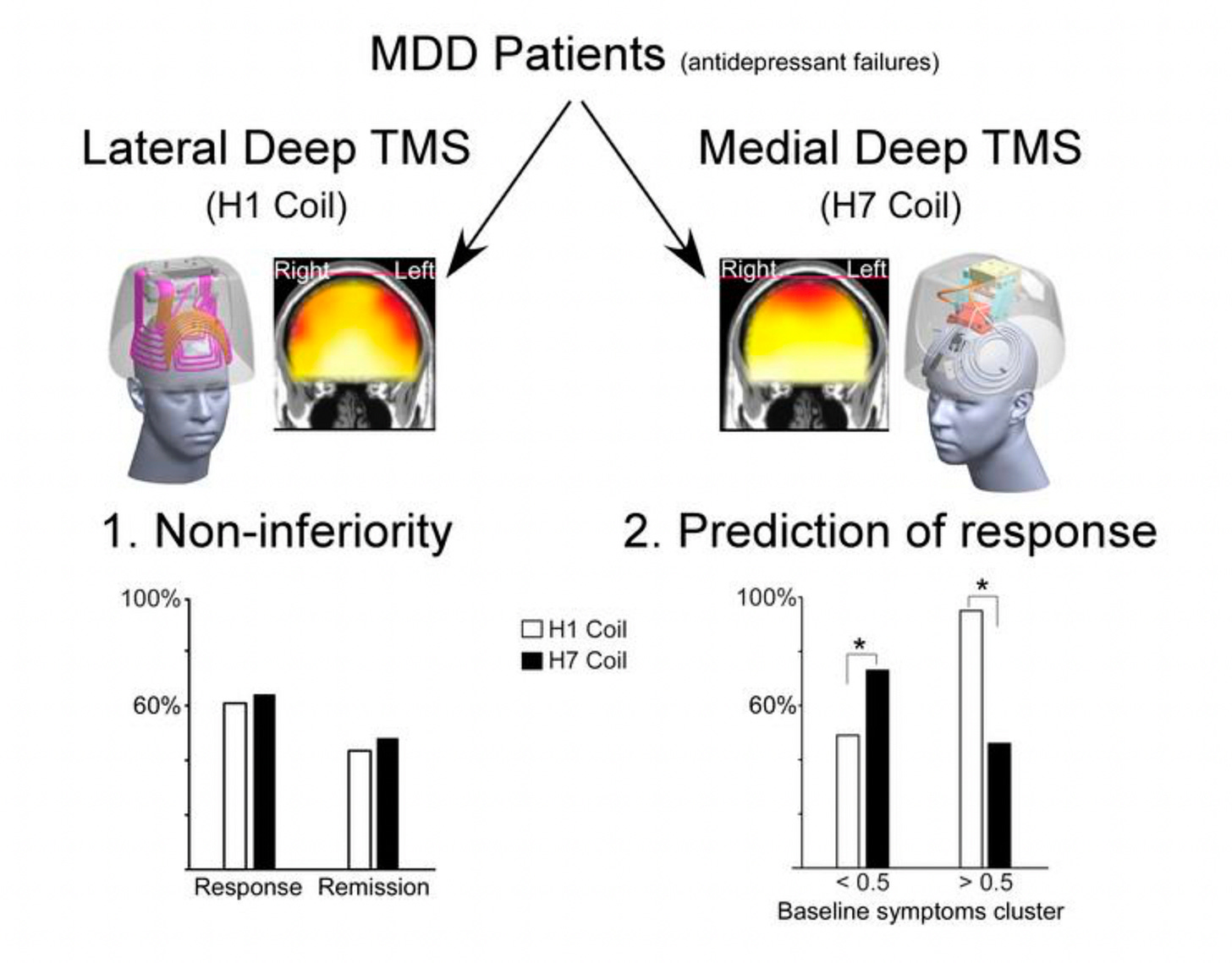 RESULTS. Clinical efficacy and safety profiles were similar …between groups, with response rates of 60.9% for the H1 Coil and 64.2% for the H7 Coil. Moreover, brain activity measured by EEG during the first treatment session correlated with clinical outcomes in a coil-specific manner, and a cluster of baseline clinical symptoms was found to potentially distinguish between patients who can benefit from each Deep TMS target.