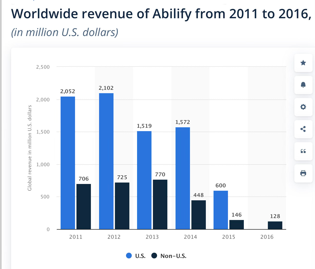 This is one of the many medications in the pantheon of psychiatric treatments that I have had the pleasure of taking in the past. I gained about 60 pounds on this medicine! That problem is not unique to me, and it features prominently in the story of Abilify. It was a blockbuster drug for Otsuka Pharmaceuticals, at its peak, bringing in around $6.9 billion in annual sales.
