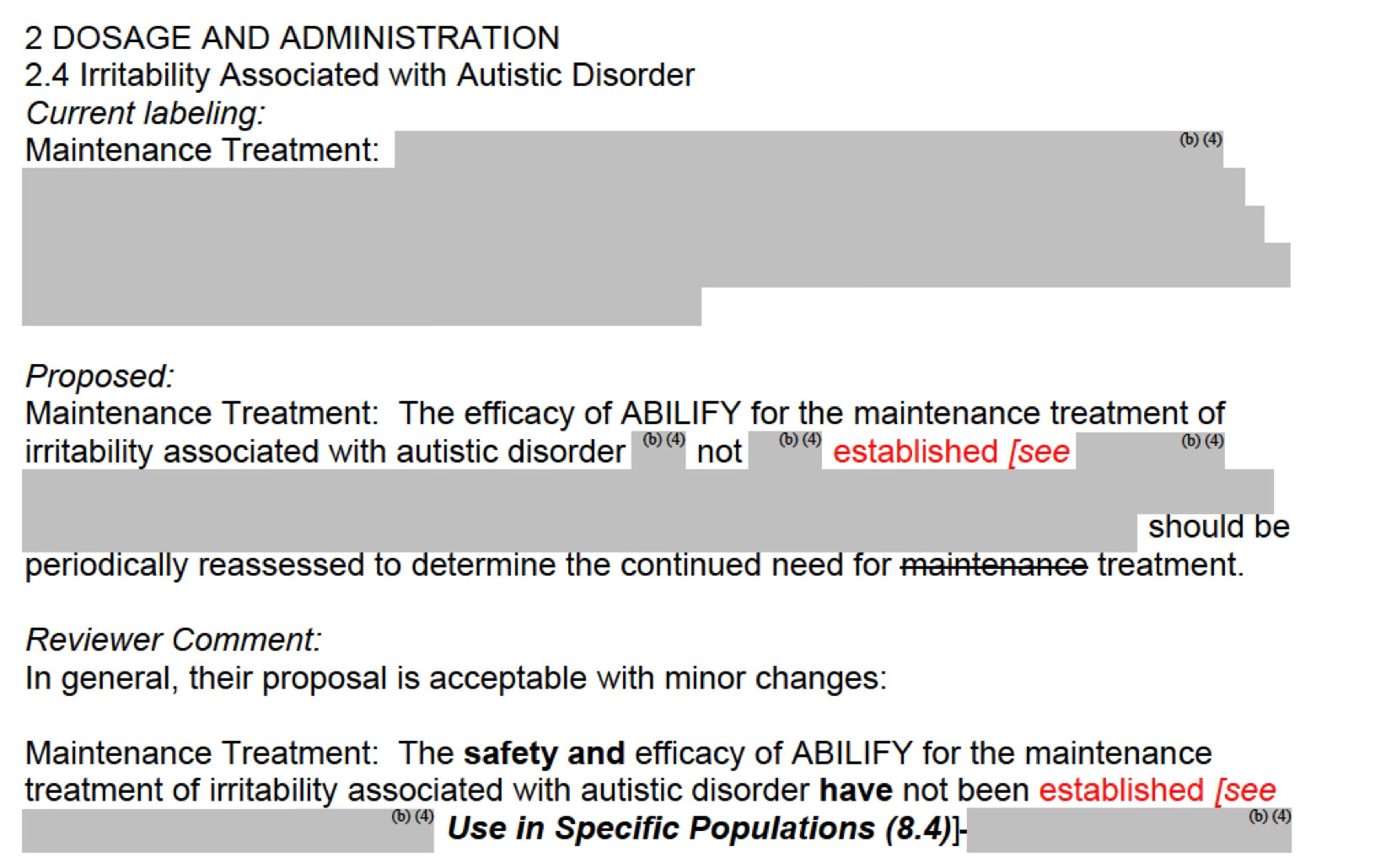Although the initial FDA approval trials established the superiority of Abilify to a placebo in the acute treatment of irritability in pediatric patients with autism, this effect was not sustained, and the FDA declined to provide a label for “maintenance” of this acute treatment given the negative study results submitted by Otsuka for the indication. This result is especially notable given the long-term risks of aripiprazole including weight gain in 25% of irritable, autistic kids: