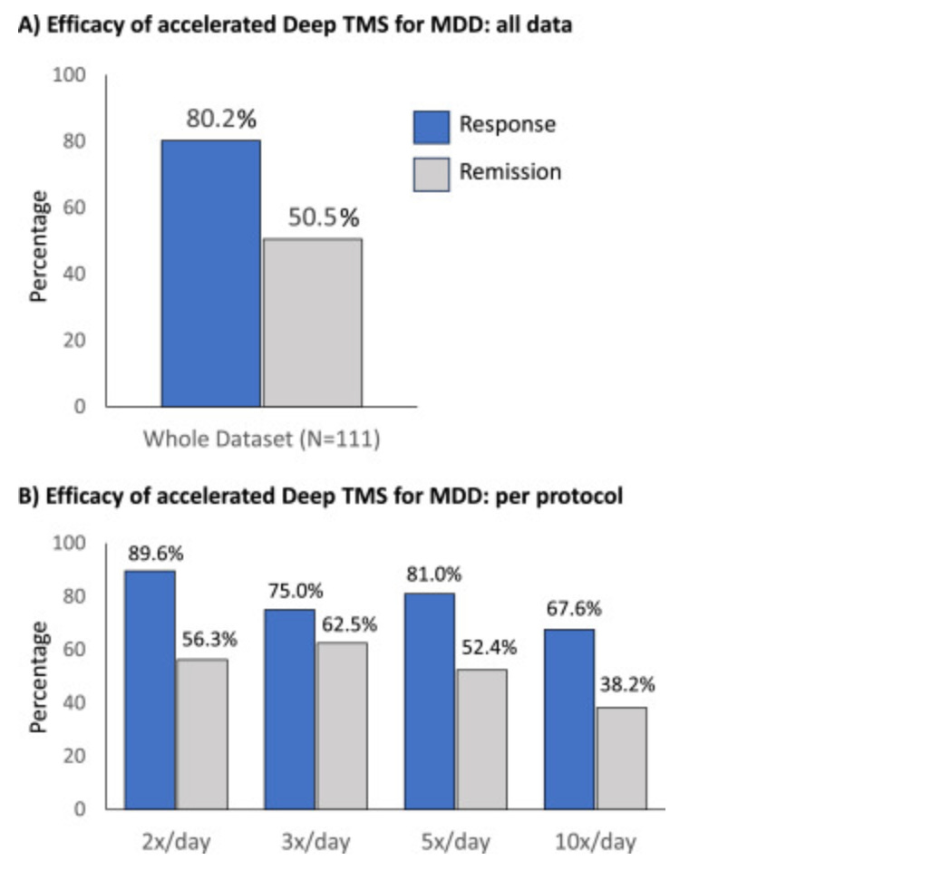 HDRS-21 depression scores, after statistical adjustment, were reduced by 19.02 and 19.79 points in the accelerated and standard Deep TMS groups, respectively; and response and remission rates were 87.8% and 78.0%, respectively, for the accelerated group