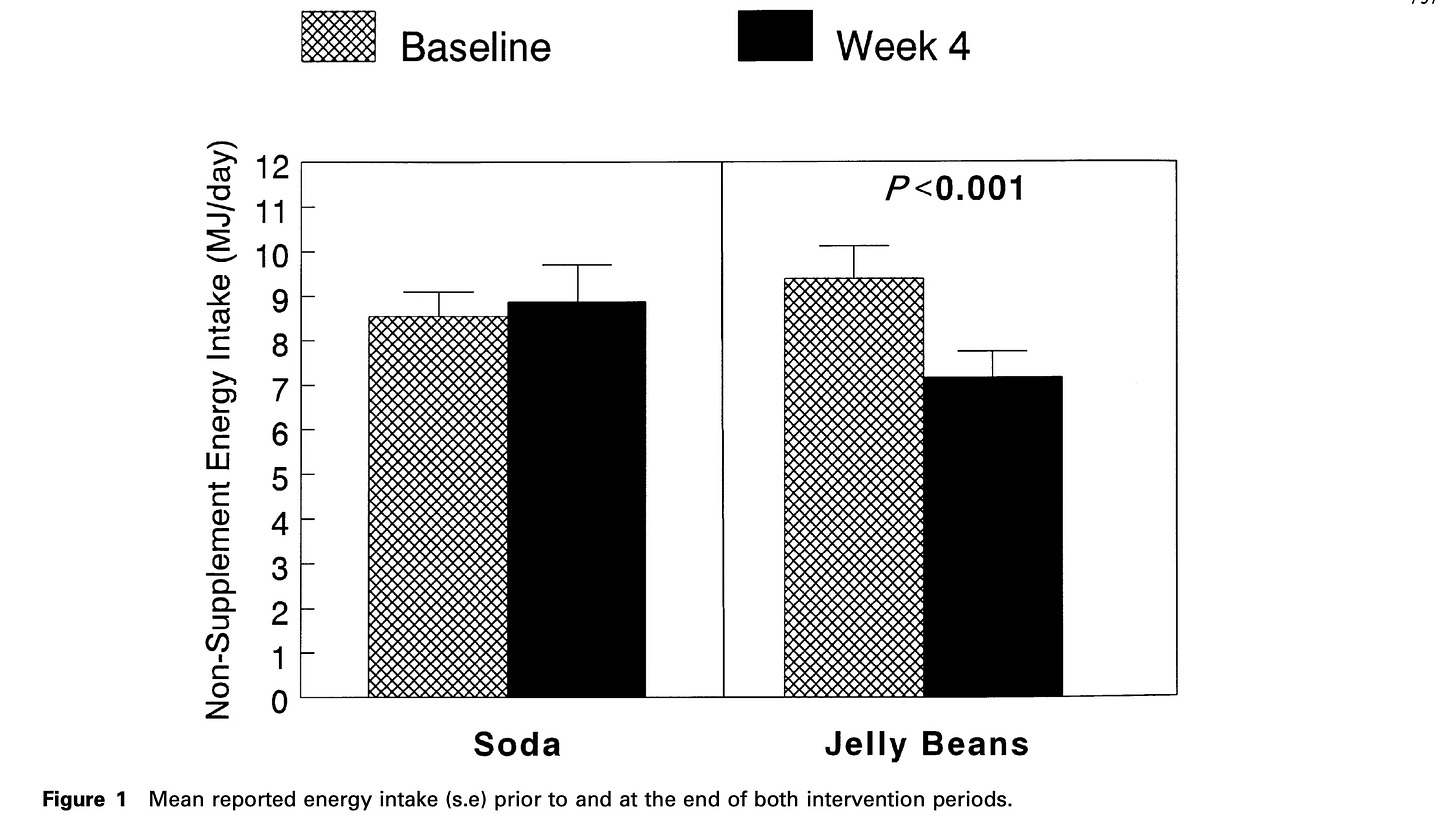 Drinking calories is vastly worse, on average, than eating them. This is true even when you are comparing sugary sodas vs the paragon of health food…jelly beans1: