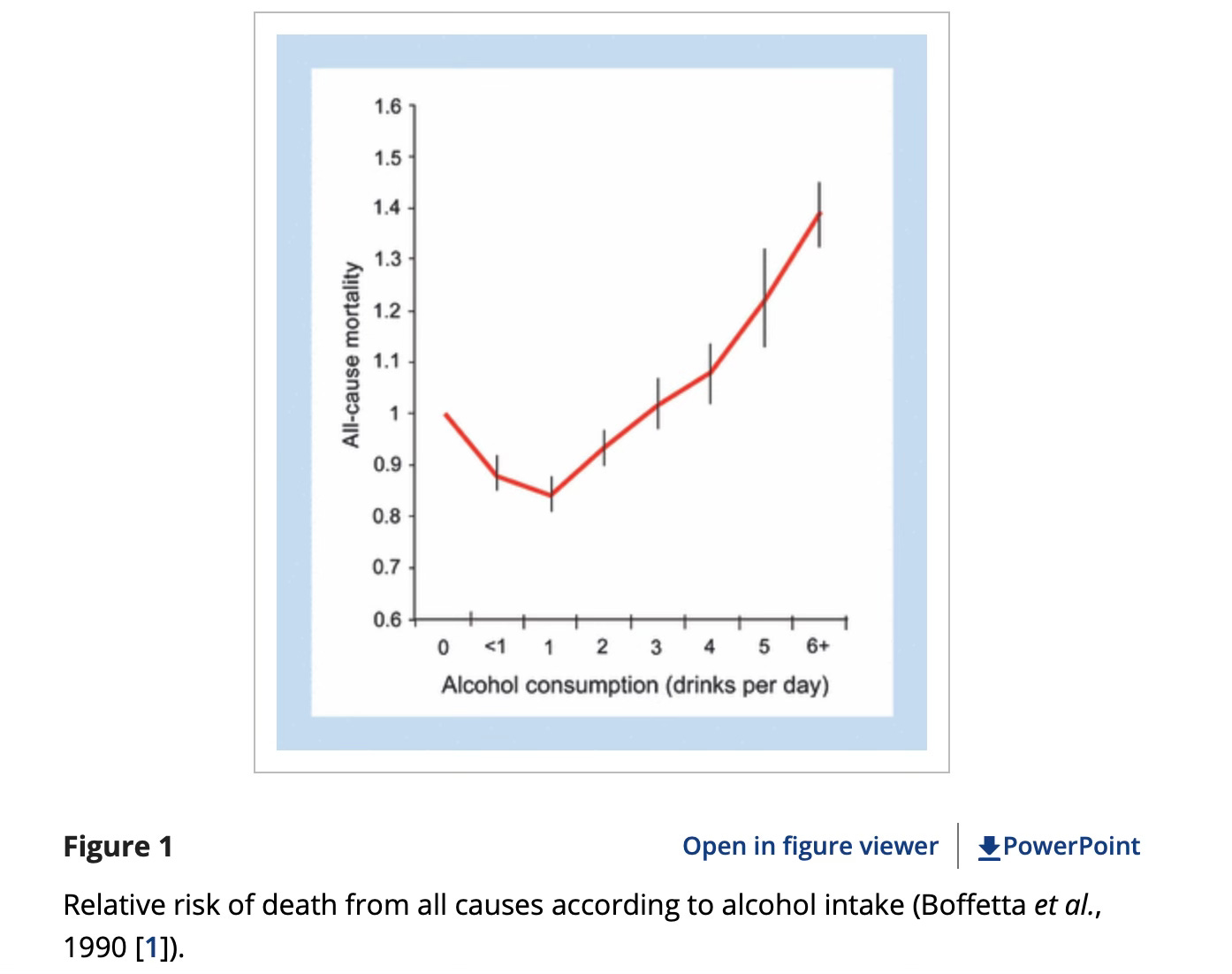 The relative risk of death goes up with drinking. Maybe…maybe 1-2 drinks is ok. Anything past one drink is not. If you can find me an alcohol enthusiast who just drinks one drink a day and also wouldn’t appreciate not having to walk three extra miles a day to make up for it, let me know2: