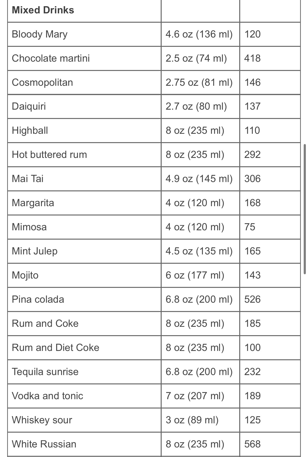 I know, right? Keep in mind—that the size of the drink matters! 2.5oz for a chocolate martini at 418kcal? That compares poorly to a whole cheeseburger from McDonald's: