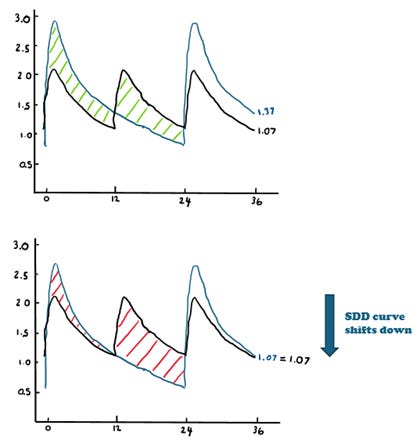 So now let us return to the paper by Castro et al. [5] that Dr Meyer references from part 2. It was a retrospective study, looking at “electronic health records from a large New England healthcare system between 2006 and 2013”. If we assume that most of the psychiatrists within the New England healthcare system did not differentiate interpretations of 12-hour levels between patients on twice daily dose and single daily dose regimens, patients who received a SDD regimen would have been on a lower mean serum concentration (Area under pharmacokinetic curve divided by time interval) than patients who received lithium twice a day (Averaged over the entire patient population).
