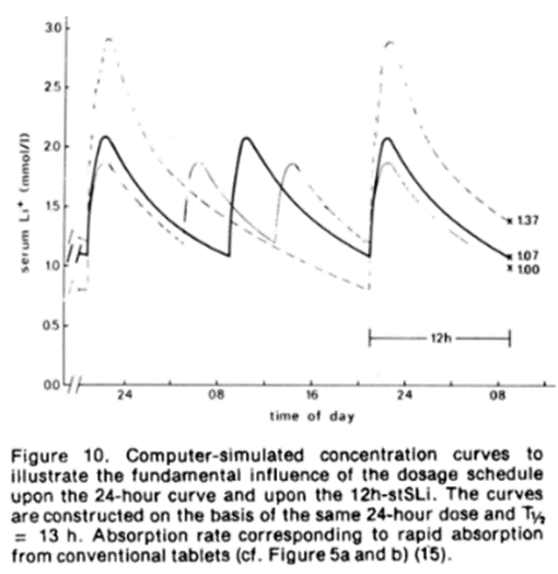’s articles on lithium in part I and part II. Lithium has remarkable data. There has been excellent coverage in the Carlat Report on recent updates in lithium, like this one. Mood disorder experts and some humans coping with bipolar disorder alike appreciate Lithium. Alex attended a lecture by an “expert” in lithium dosing. He noticed a problem. So now a physicist has decided to present his counter-argument to the world, and The Frontier Psychiatrists is the platform. It’s no Stahl’s Guides, but it will have to do:“Multiple daily dosing distorts the level.”