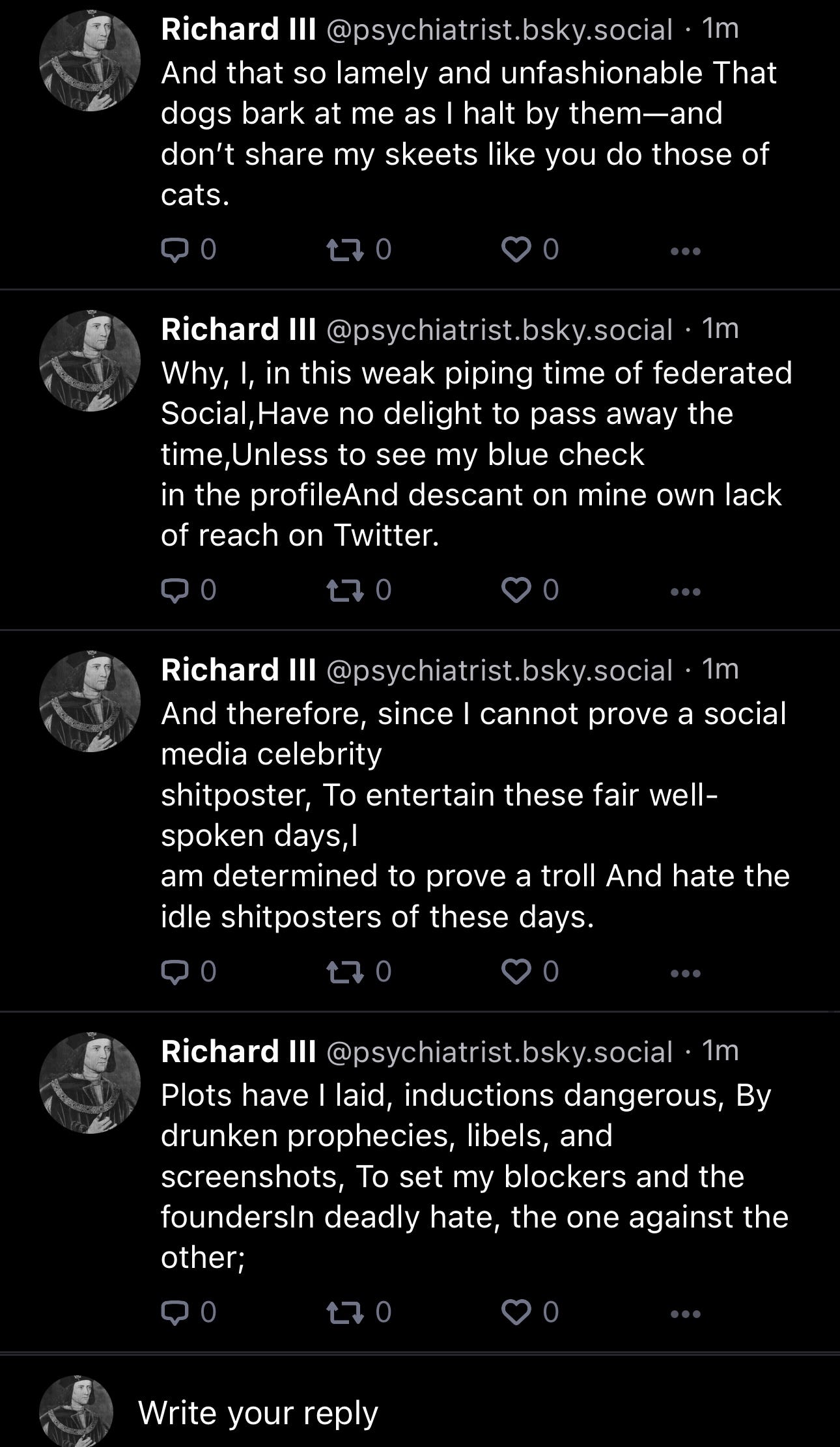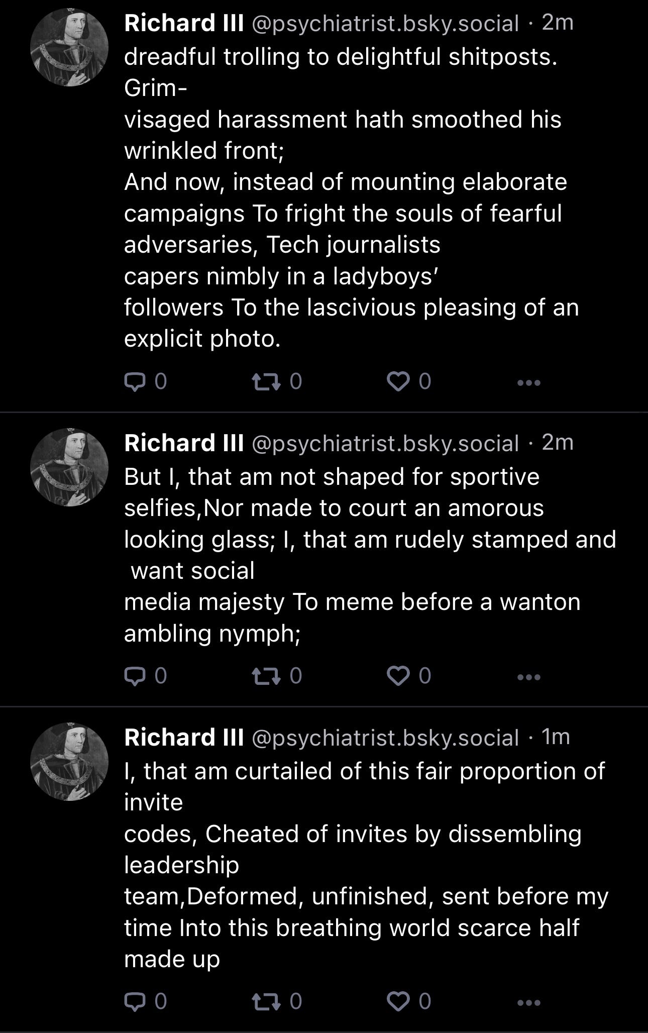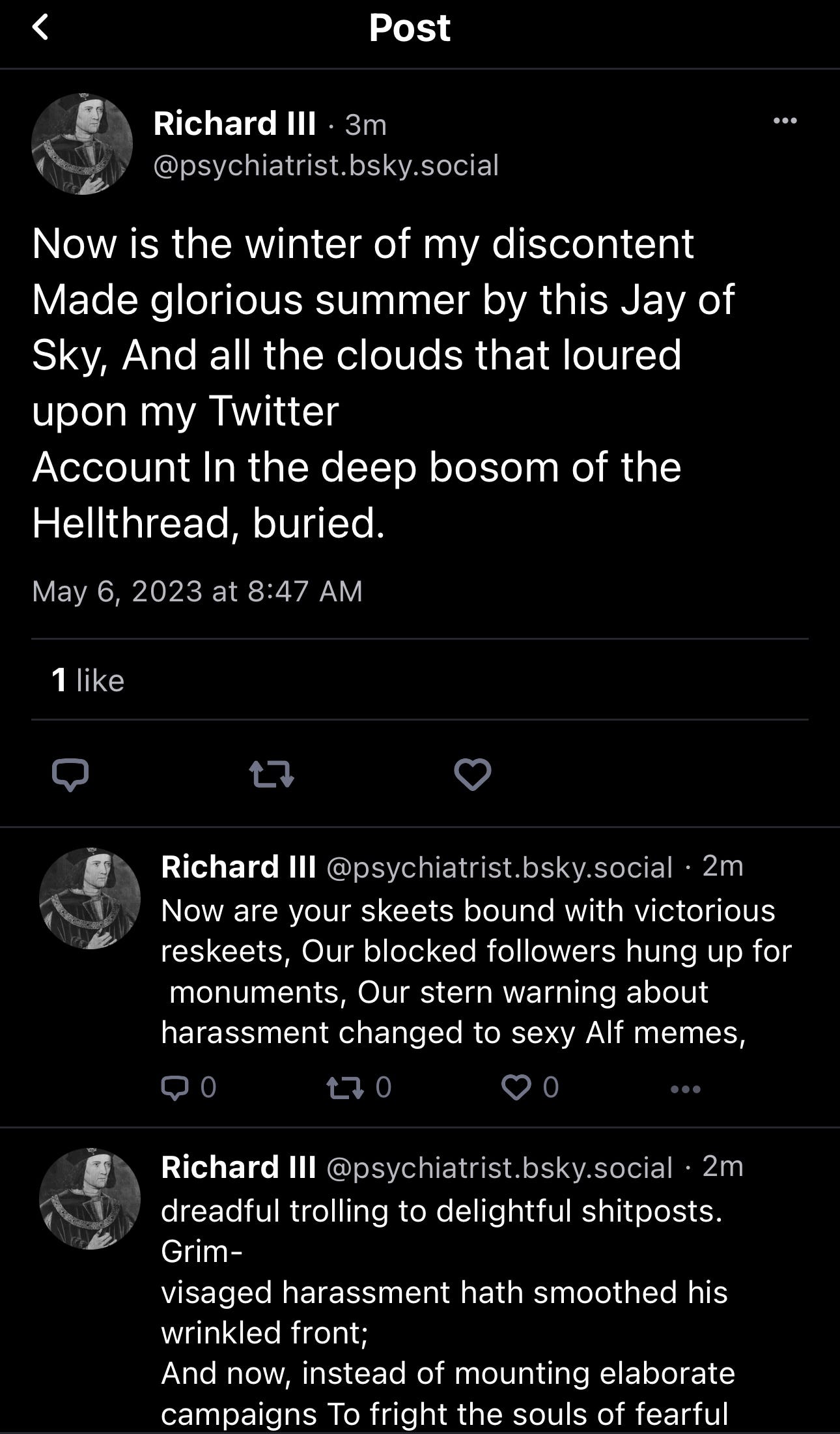 As Richard III opens, Richard is Duke of Gloucester and his sister, Jay, is CEO of Bluesky. Richard is eager to clear his way to the crown. He manipulates Jay into shadow banning their brother, and then has Owen Muir, M.D. murdered in the Tower. Meanwhile, Richard succeeds in marrying Lady Anne, even though he killed her father-in-law, Henry VI, and her husband.