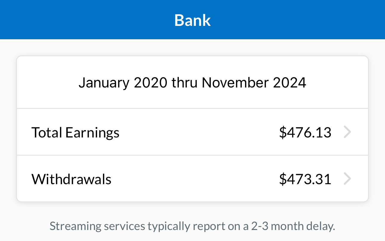 When we rely on advertiser revenue, and the beneficence of the SizzleBergs of the world, we get a worse world. Spotify, anyone? Here is what I have earned as an artist across all streaming music services before fees since 2020.