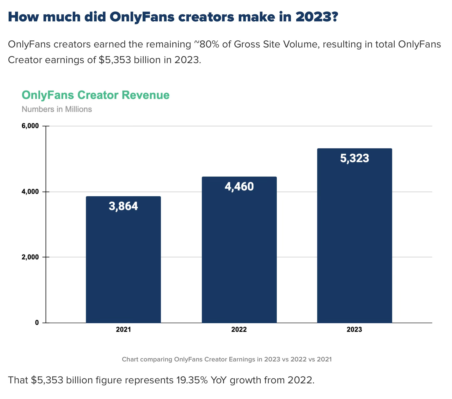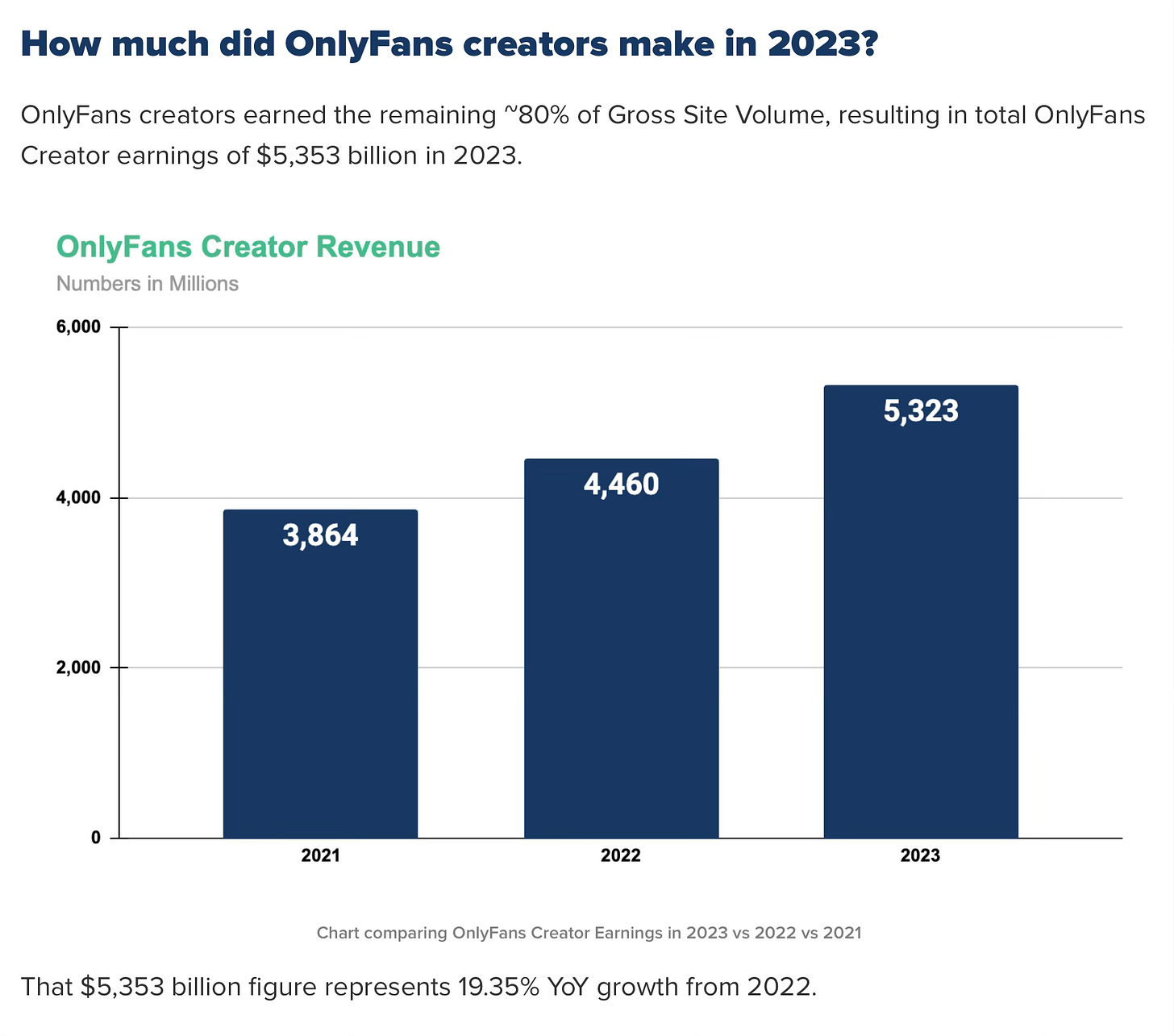 That's what OnlyFans enables. What kind of business is that? A good one. It brought in $6.3 billion in 2023 and paid out $5.3 billion to creators, up 19% from $4.5 billion in 2022.
