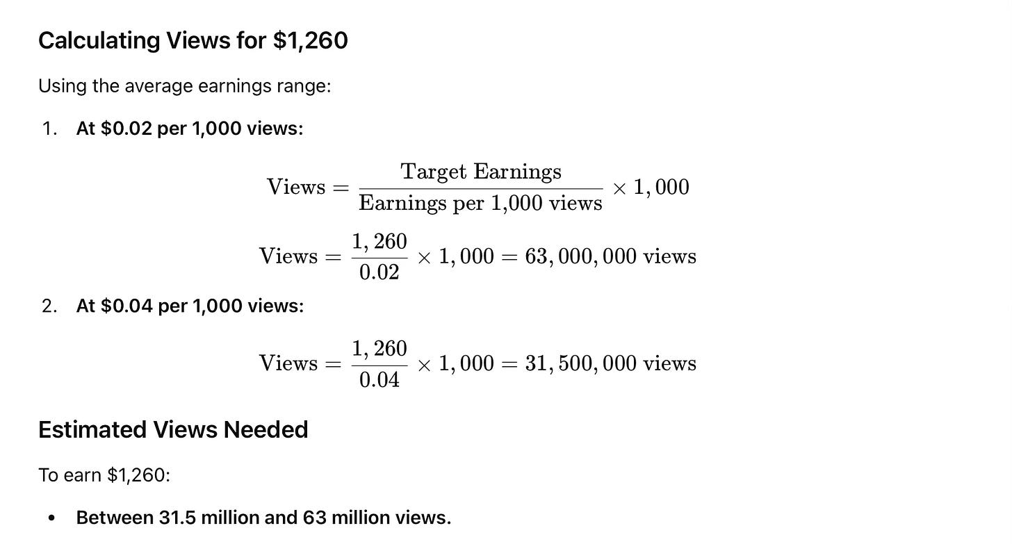 Thus, to make average-OnlyFans money, a TikTok creator would need 10,000 followers built with no reimbursement in the process and need to crank our absolute bangers that bring in between 31,500,000 to 63,000,000 views. Here is the math: