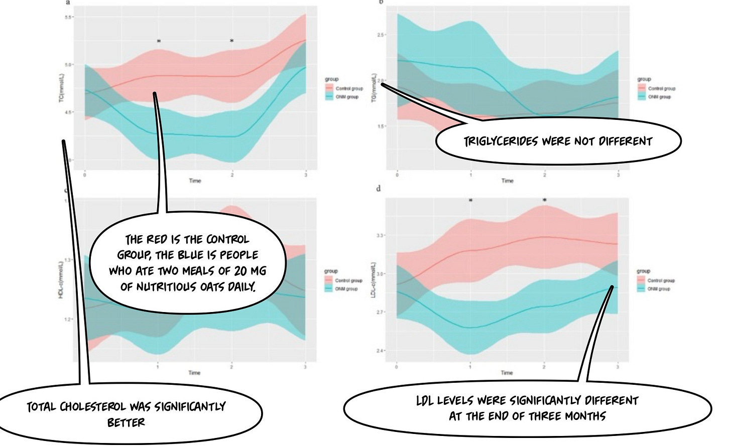 My readers are, no doubt, asking themselves: “Has there been an RCT?” Well, there have been some. A paper from China randomized adults with high cholesterol to instant oatmeal vs wheat flour-based noodles.3 It led to improvements: