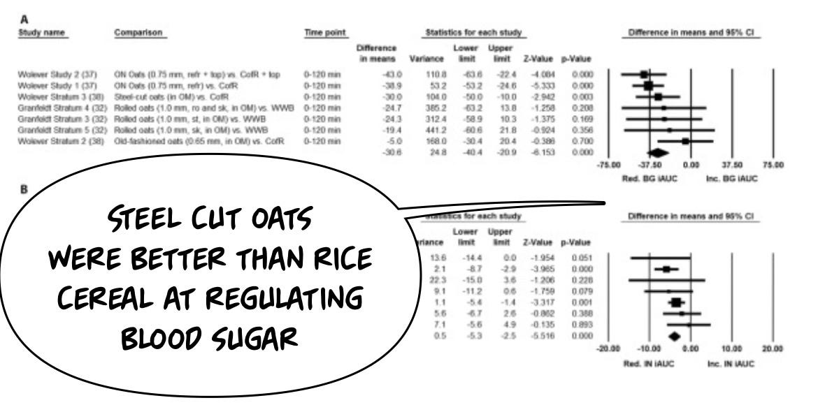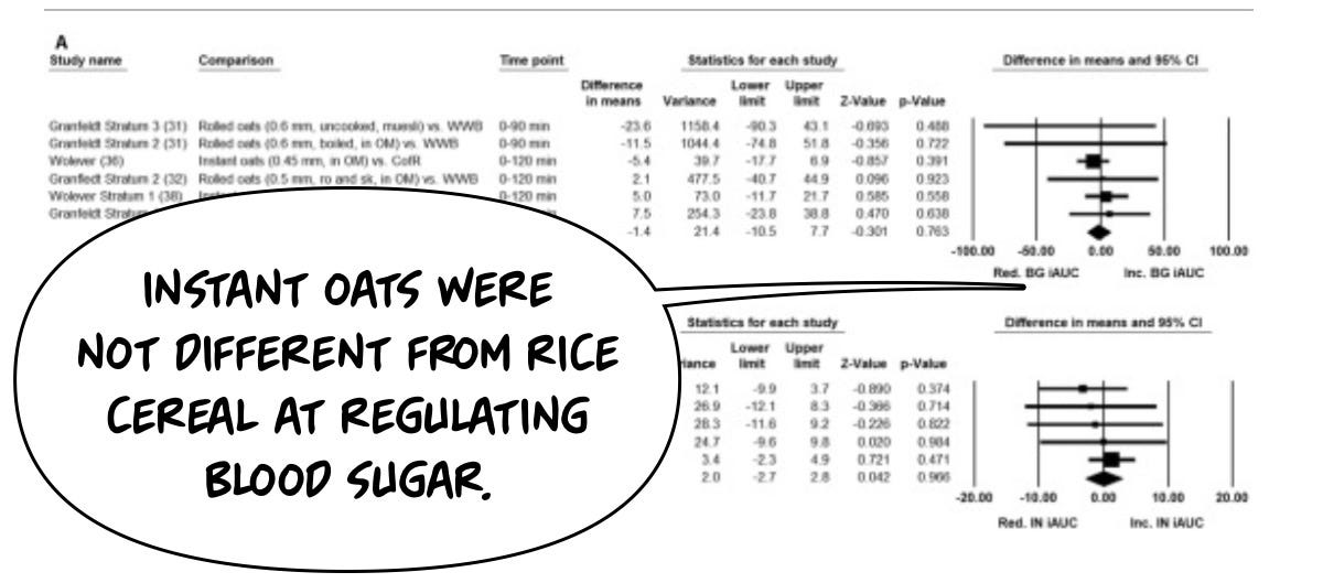 The authors meta-analyzed all of the studies on oatmeal, and subgrouped instant oatmeal vs thick (a.k.a. Steel-cut Oats). They then compared their impact on blood sugar, with the comparison group being rice cereal: