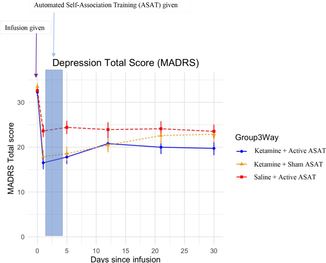 In this 3-arm RCT (N=154 TRD patients), all participants received a single subanesthetic ketamine infusion (0.5 mg/kg) or placebo (saline) infusion, and were then assigned to either an active computerized therapy (“Automated Self-Association Training”, ASAT) or a sham control program, over the following 4 days.