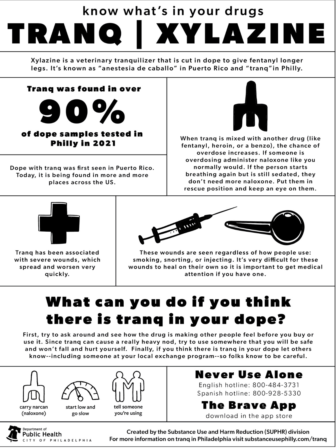 Although research has yet to definitively prove that xylazine causes skin ulcers, there appears to be an association between the two. People who regularly use xylazine often have severe skin ulcers and abscesses. Since xylazine became more prevalent in Philadelphia’s drug market, local hospital systems have reported increased skin and soft tissue infections. These wounds present atypically, often all over the body (away from the site of injection), and appear to worsen more quickly than other skin infections.