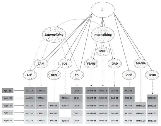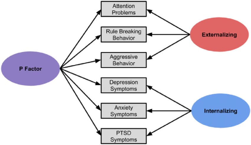 What Caspi, Fonagy, and others have argued—persuasively, to your author—is that the best “model fit” for psychiatric problems, over time, is that a single measure, “the amount of psychopathology” or “how sick someone is” is a better predictor than individual (myriad) diagnosis over time. A high “sickness” burden predicts subsequent “sickness” better than “schizophrenia predicts X outcome later.”