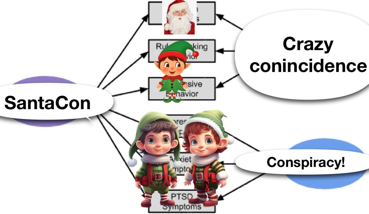 The factor analysis approach—what math, based on observed data, predicts the best array of underlying factors? Does a “crazy coincidence best explain some Santas and Some Elves” plus another elf cohort explained best by a “conspiracy?” No, of course, on factor—a day on which people agree to dress up as Santa and go drinking explains the movement disorder, the outfits, and the crowds better than multiple explanations. It’s the reason we have statistics—including causal inference in statistics. (Amazon affiliate link).