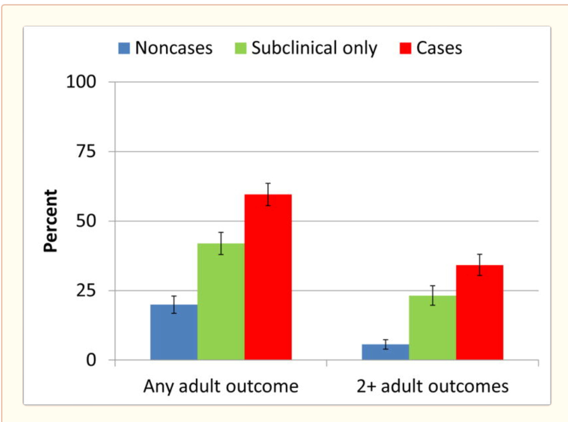 If we have treatments for sicker people, we’d want to deploy them to people who need them. We have some of those3, plausibly—like mentalization-based treatment, for example. In the following graph, we see the outcomes of kids with diagnosable psychiatric illness (red) vs milder symptoms (green) vs. kids without psychiatric illness (blue). We see more problems—general medical and psychiatric!—over time in adults who had psychiatric problems as kids. More bad outcomes are best predicted by psychiatric illness in childhood.