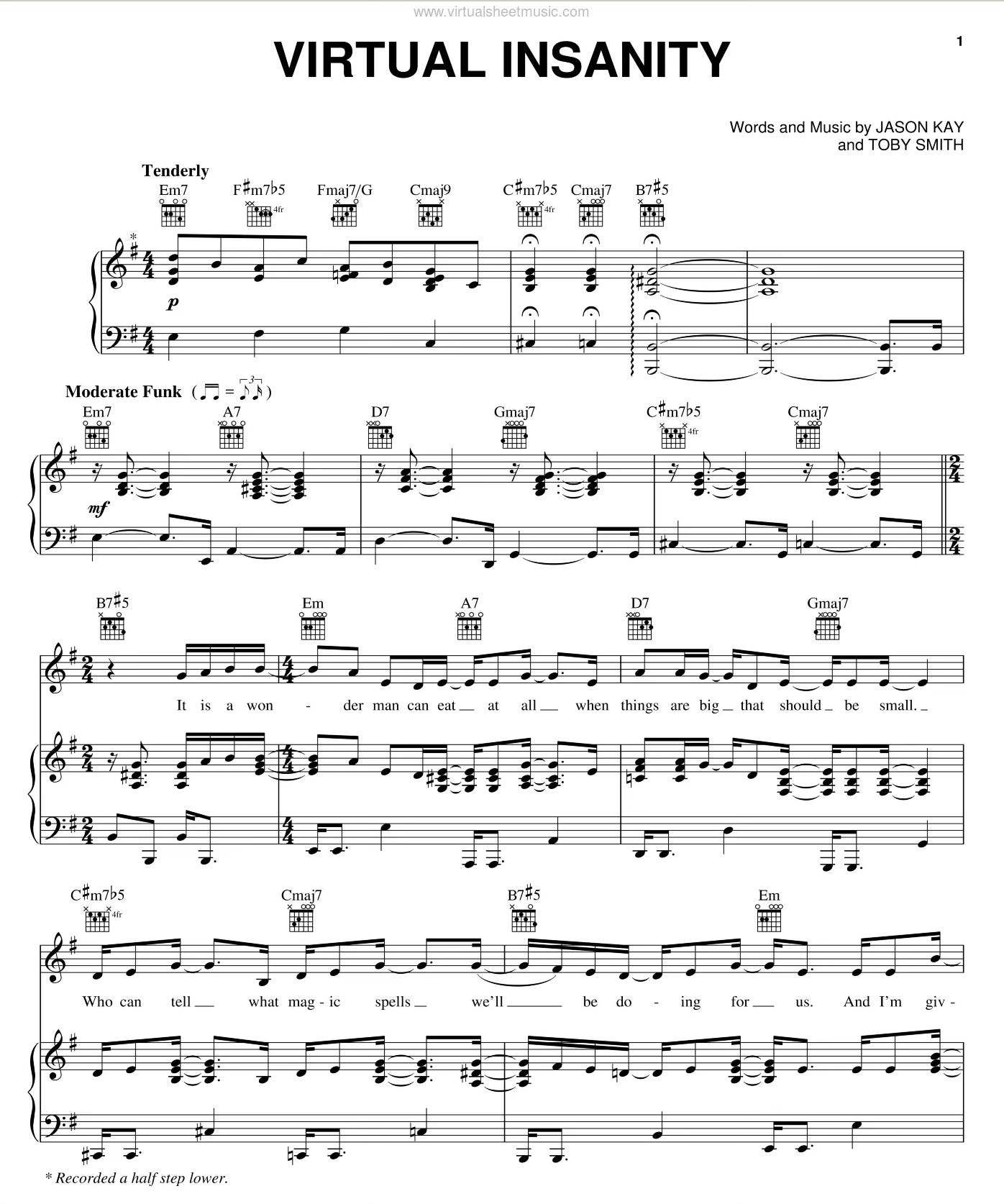 Some of the time, when I sit down to figure out a cover song, I realize that the music is quite a bit more complicated than I thought at first. Some of the tunes we bop around to on the regular are breathtakingly complex. Yesterday, I was checking out “Virtual Insanity” by Jamariqoi. The first plage of the sheet music looks like this: